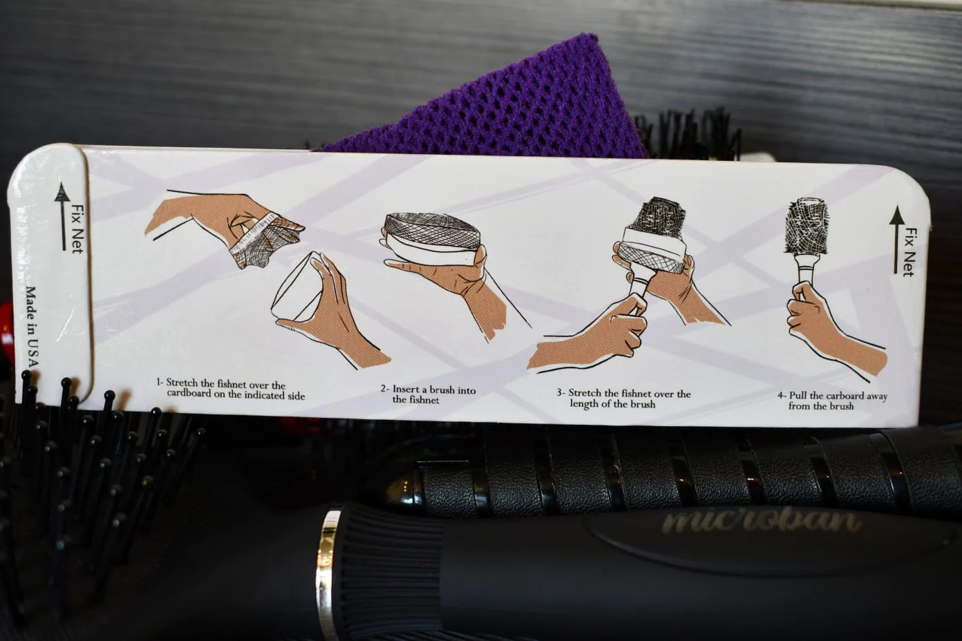 A hygienic cover for a hair brush is an elastic plastic netting of lycra polyester stitched into a tunnel shape with open and closed ends. This cover is rolled on a hollow insert with two open ends. A hairbrush is inserted into and through the insert. The closed end of the cover hits the end of the brush and the cover is stretched over the brush and sliders off the insert and compresses around the brush head.